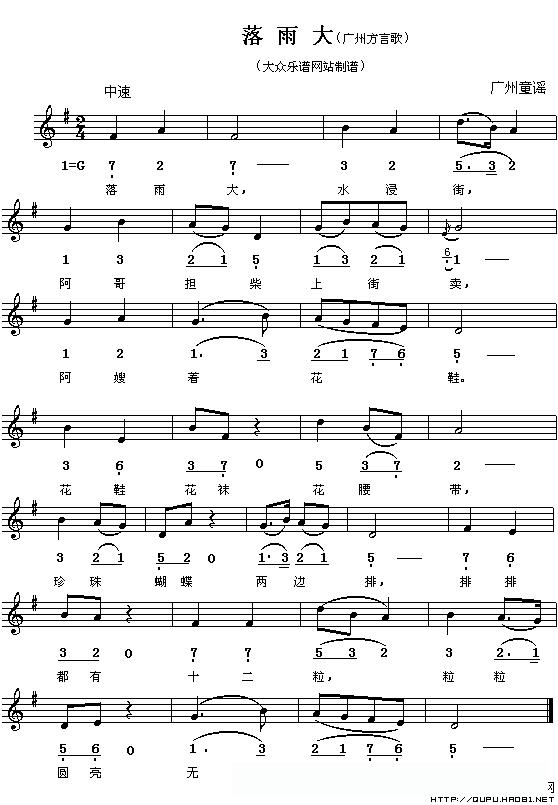 落雨大(广州童谣、线的简谱混排版)的简谱歌词