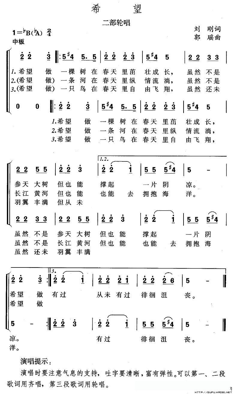 希望(刘刚词 郭瑶曲 、二部轮唱)的简谱歌词