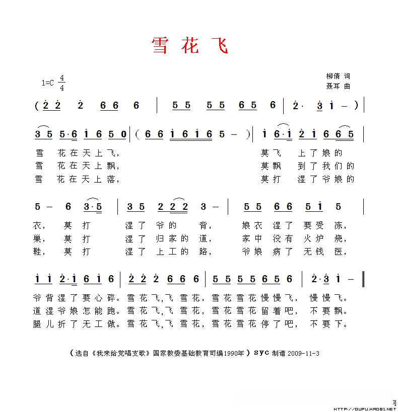 雪花飞(柳倩词 聂耳曲)的简谱歌词