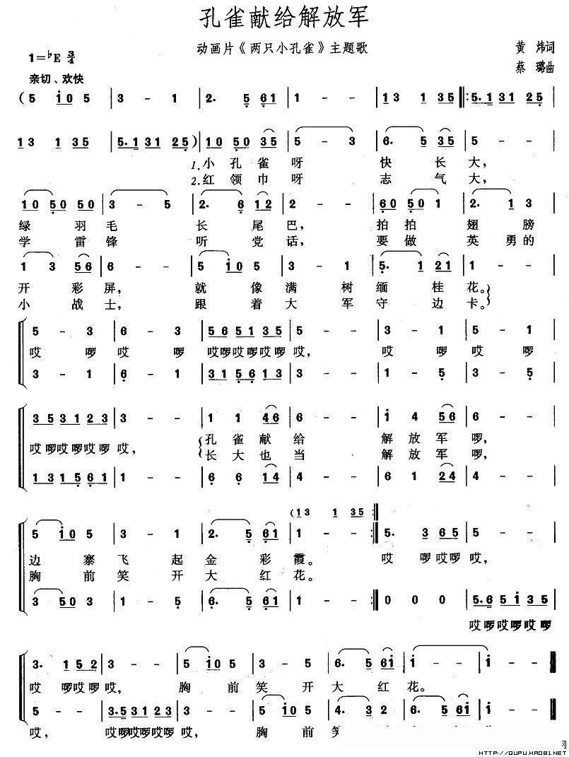 孔雀献给解放军(动画片《两只小孔雀》主题歌)的简谱歌词