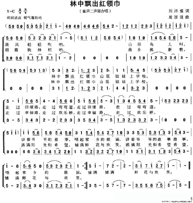 林中飘出红领巾(童声二声部合唱)的简谱歌词