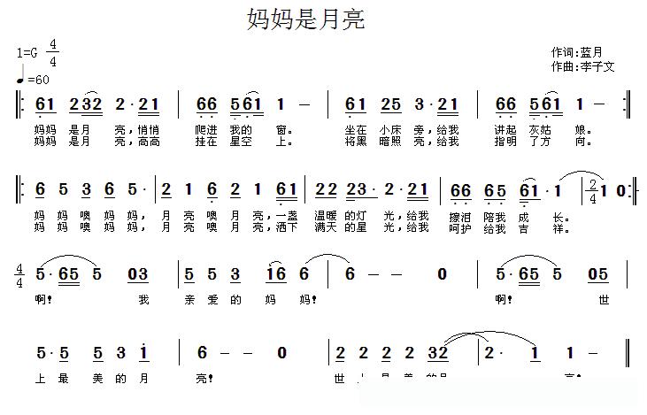 妈妈是月亮(蓝月词 李子文曲)的简谱歌词