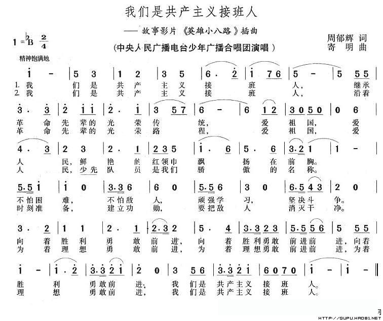 《我们是共产主义接班人》是由周郁辉作词,寄明作曲,原为1961年公映的电影《英雄小八路》的主题曲。这首歌旋律高亢,充满革命激情,于1980年被评为全国少年儿童文艺创作一等奖。