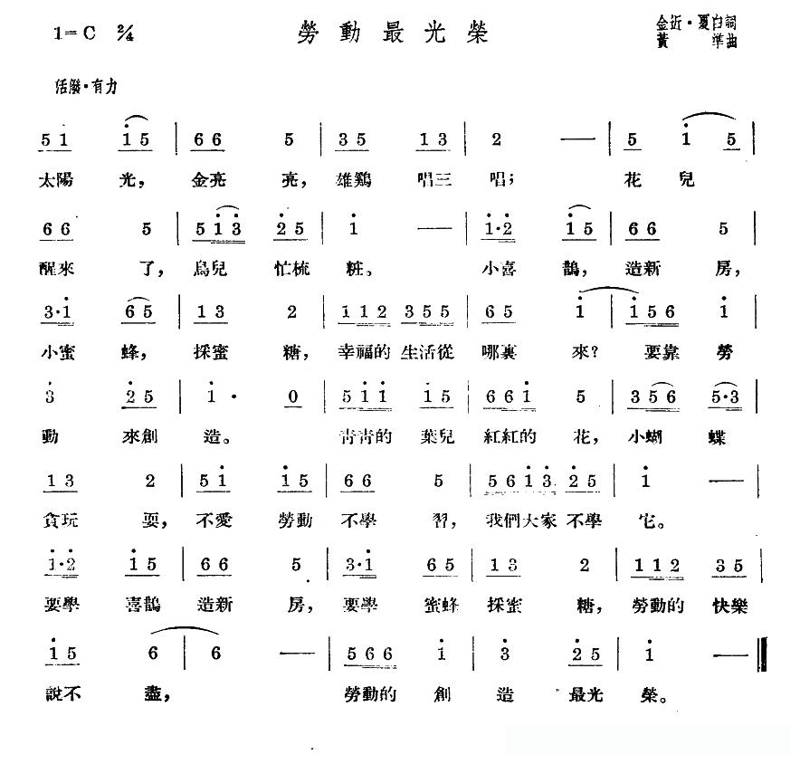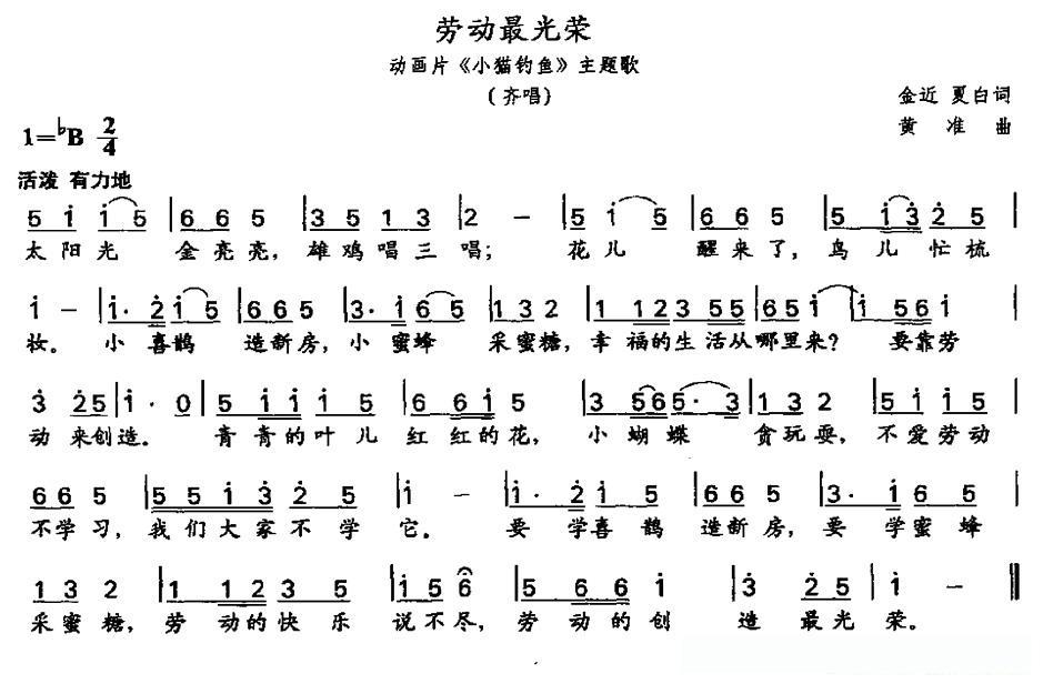劳动最光荣(动画片《小猫钓鱼》主题歌)的简谱歌词
