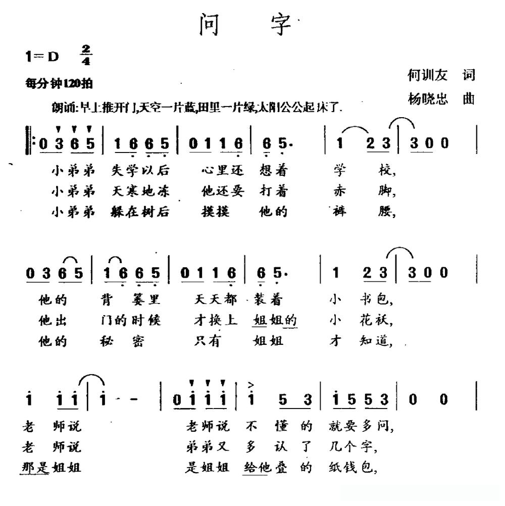 问字(合唱)的简谱歌词