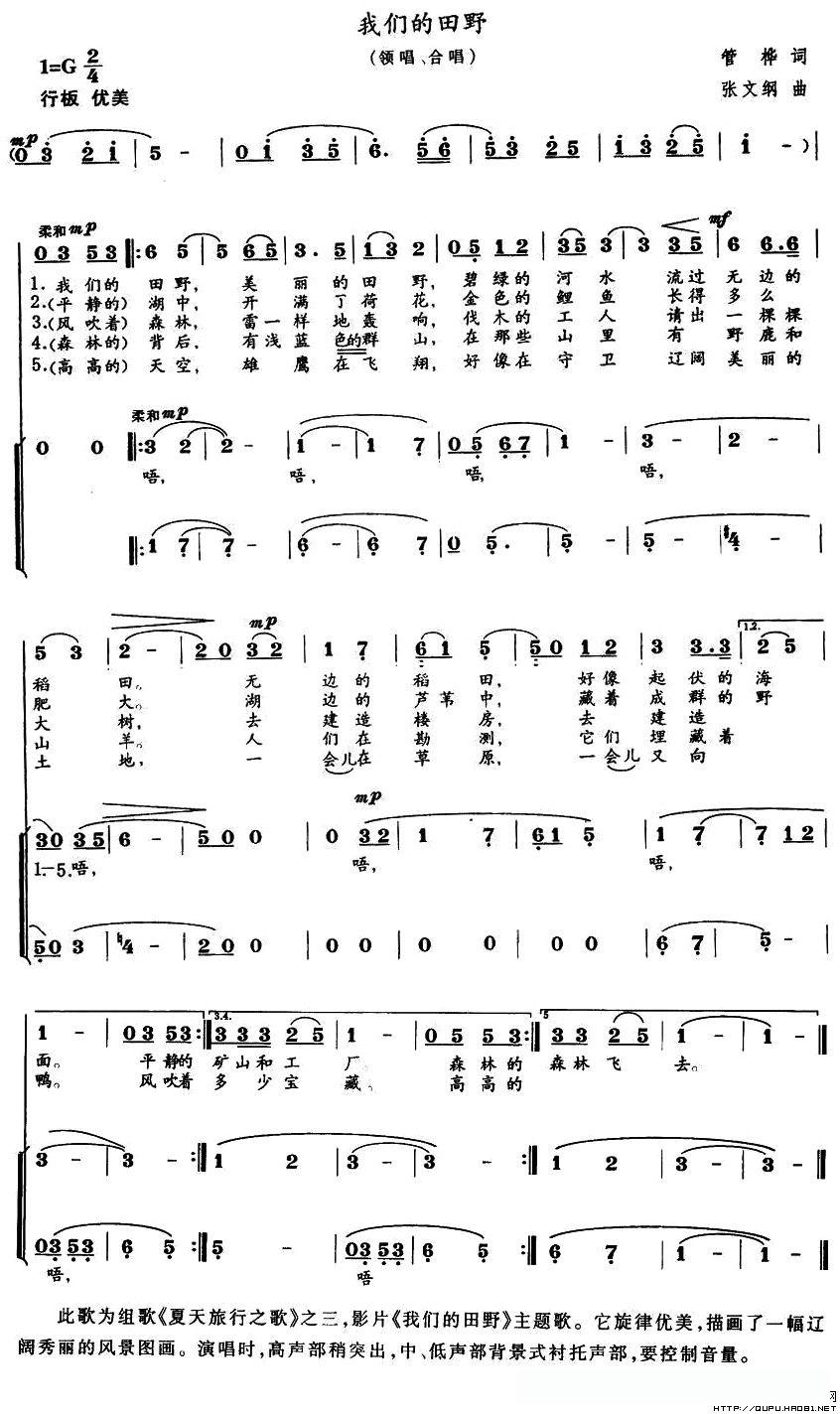 我们的田野(合唱、带前奏)的简谱歌词