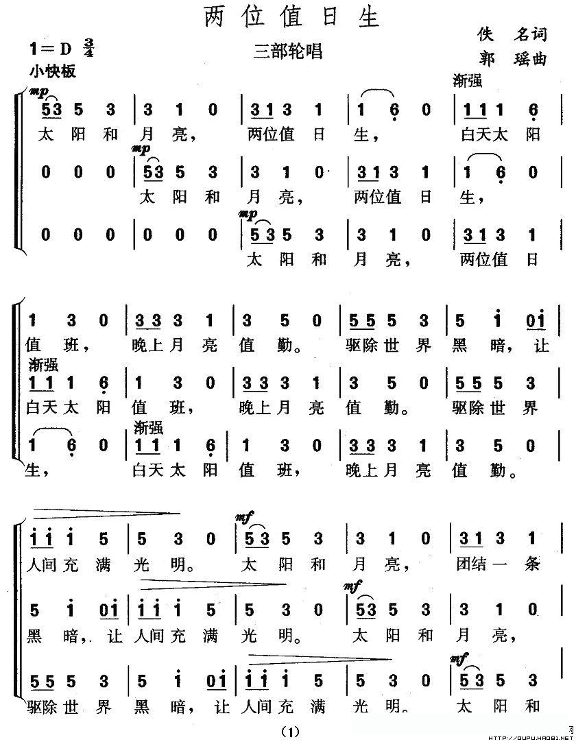 两位值日生(三部轮唱)的简谱歌词