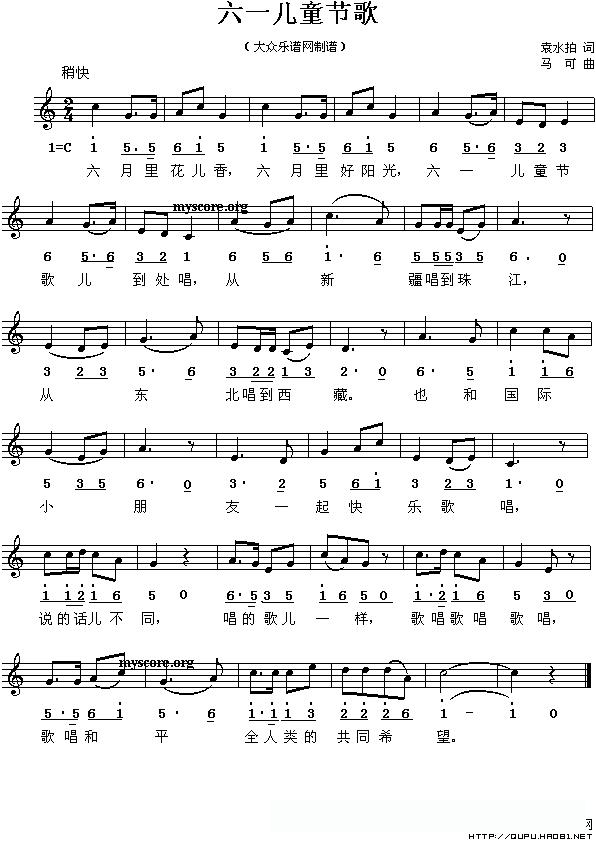 六一儿童节歌(袁水拍词 马可曲、线的简谱对照版)的简谱歌词