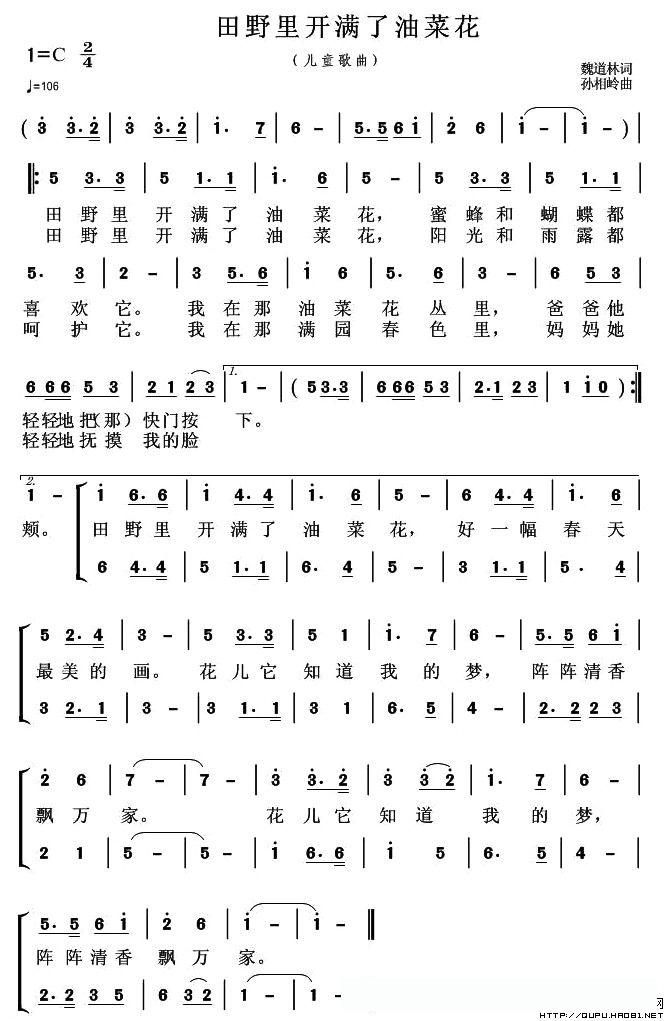 田野里开满了油菜花的简谱歌词