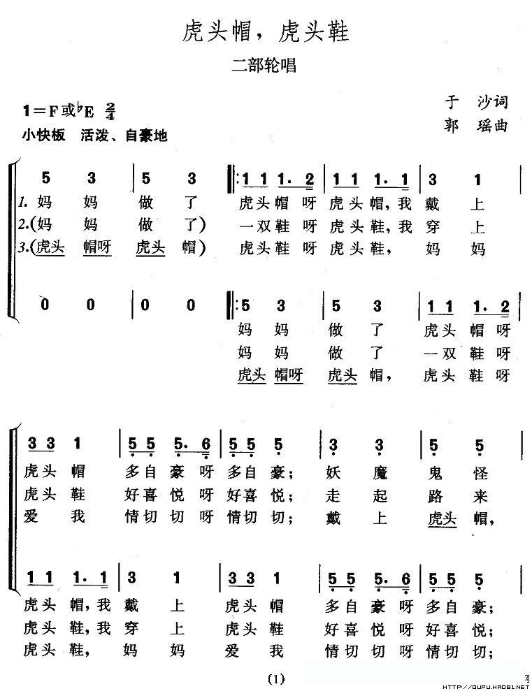 虎头帽,虎头鞋(二部轮唱)的简谱歌词虎头帽,虎头鞋(二部轮唱)的简谱歌词
