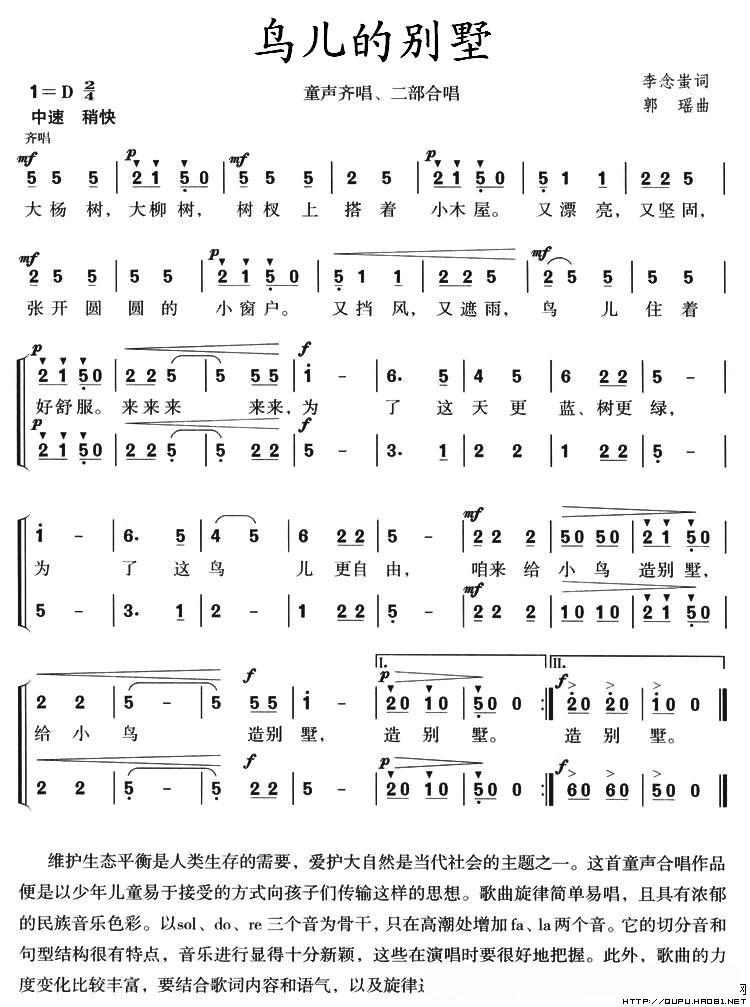 鸟儿的别墅(童声齐唱、二部合唱)的简谱歌词