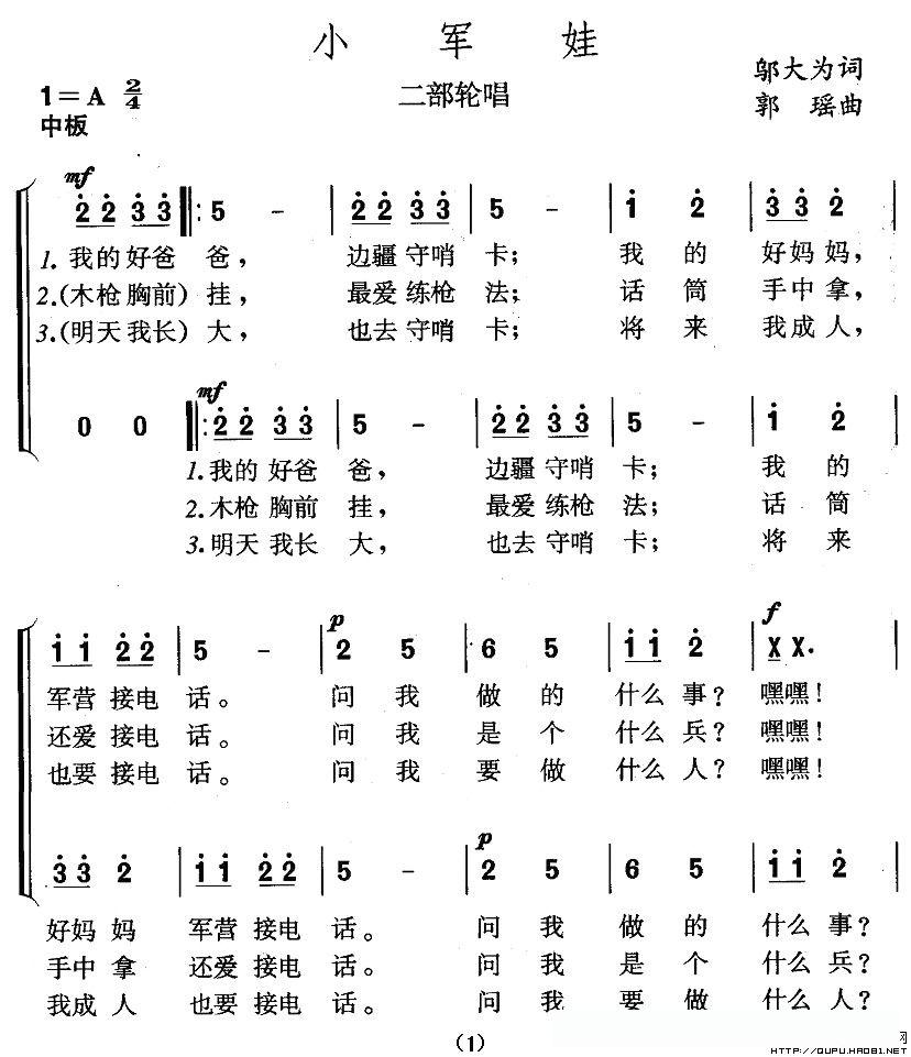 小军娃(邬大为词 郭瑶曲、二部轮唱)的简谱歌词小军娃(邬大为词 郭瑶曲、二部轮唱)的简谱歌词
