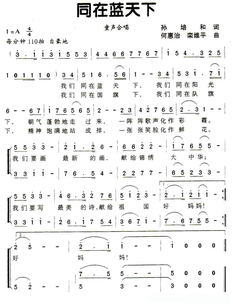 同在蓝天下(孙培和词 何慧治曲、童声合唱)的简谱歌词