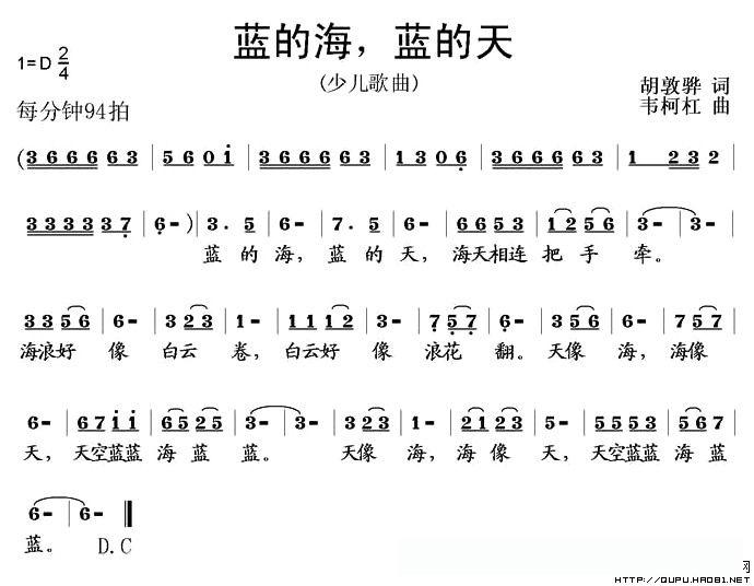 蓝的海,蓝的天(胡敦骅词 韦柯杠曲)的简谱歌词