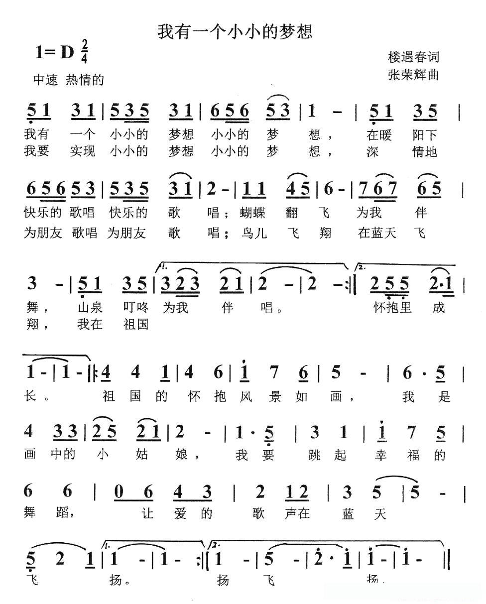 我有一个小小的梦想(楼遇春词 张荣辉曲)的简谱歌词