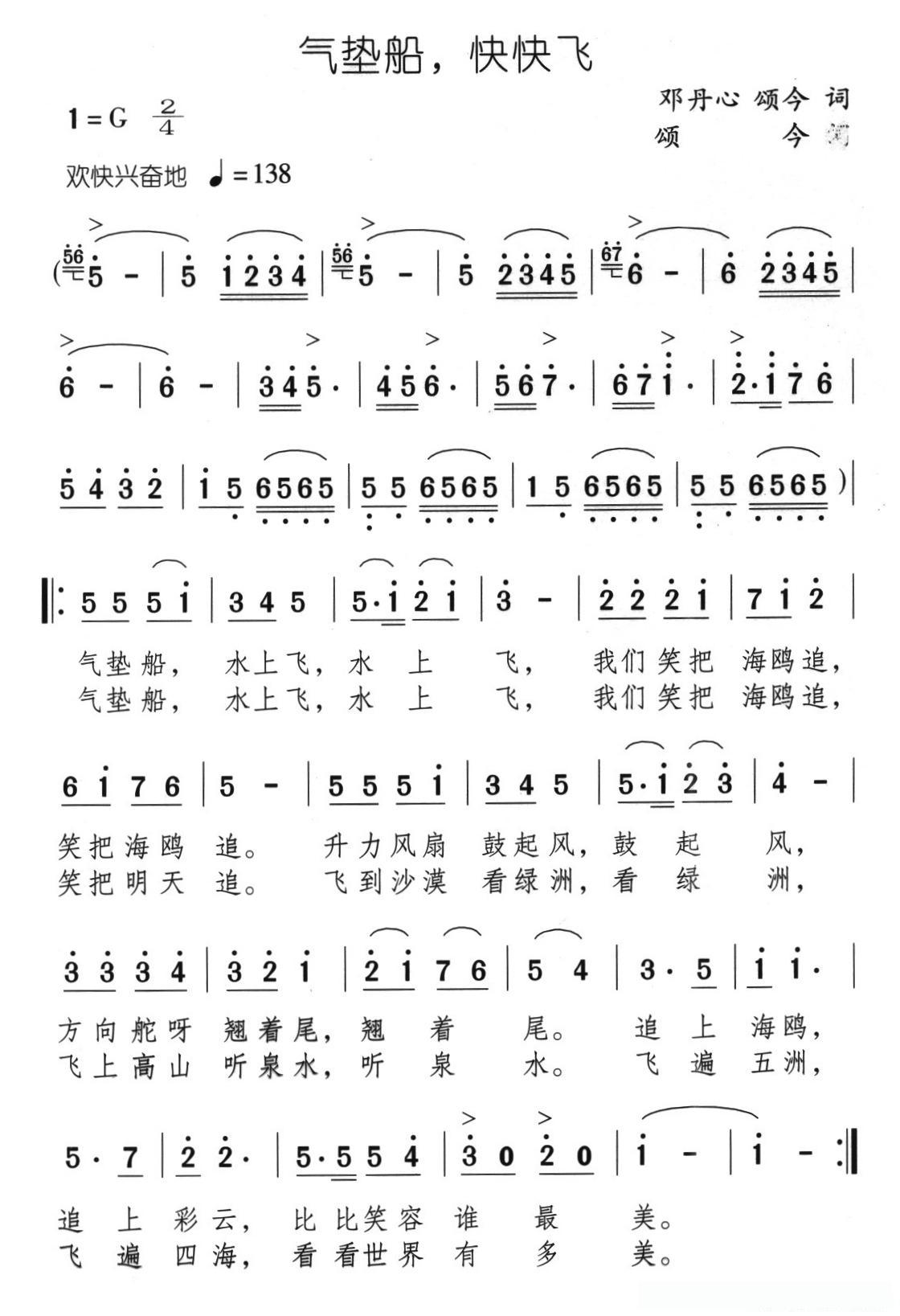 气垫船,快快飞(合唱)的简谱歌词气垫船,快快飞(合唱)的简谱歌词
