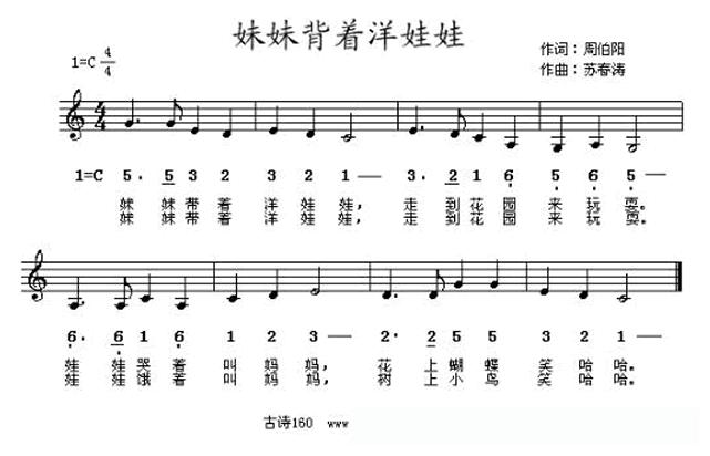 妹妹背着洋娃娃(线、的简谱混排版)的简谱歌词