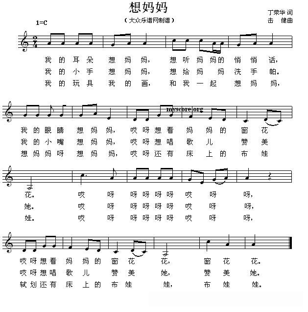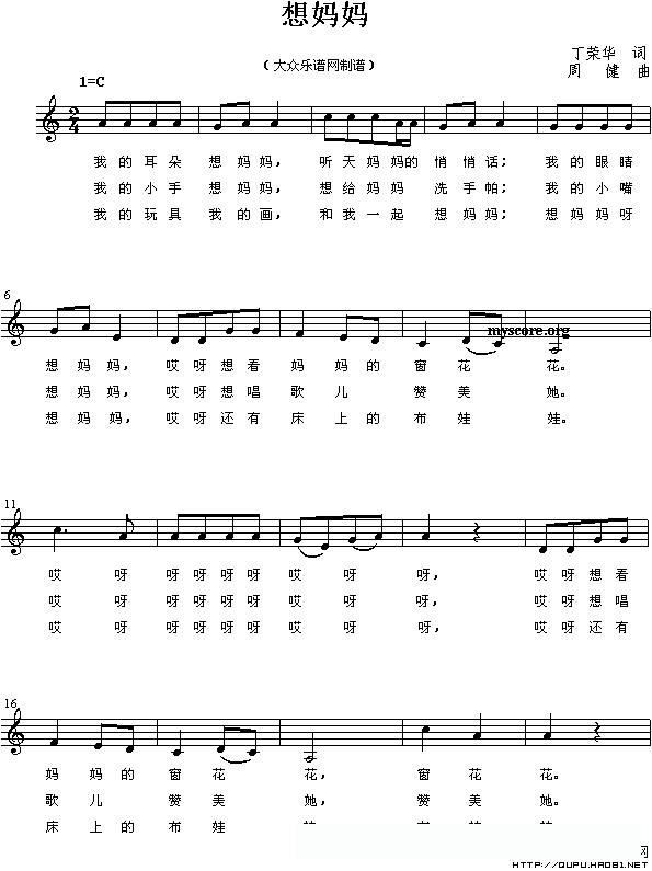 想妈妈(丁荣华词 周健曲、五线谱)的简谱歌词想妈妈(丁荣华词 周健曲、五线谱)的简谱歌词