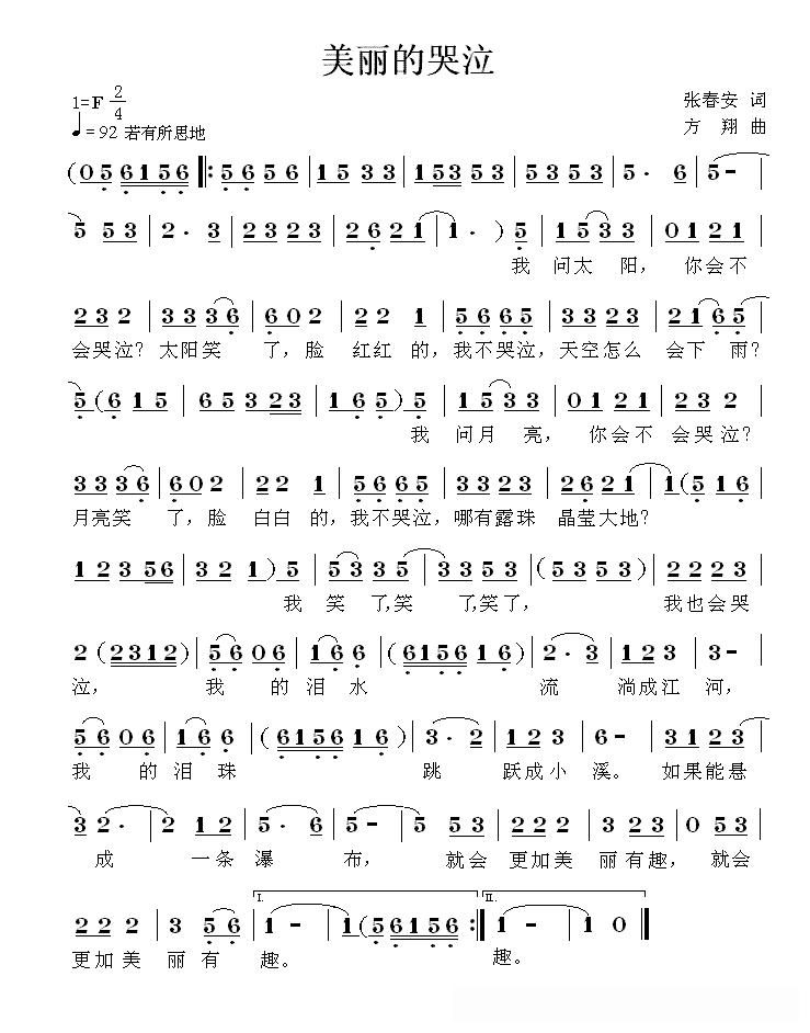 美丽的哭泣(张春安词 方翔曲)的简谱歌词