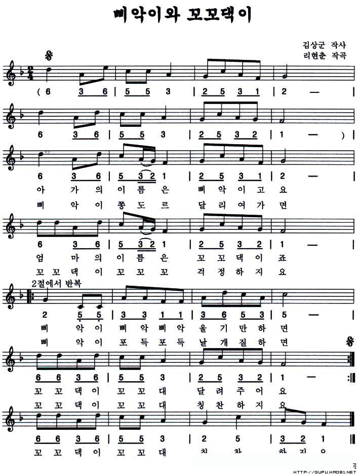 小鸡和母鸡(朝鲜族文、线的简谱混排版)的简谱歌词