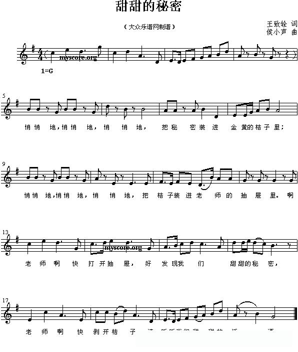 甜甜的秘密(五线谱)的简谱歌词