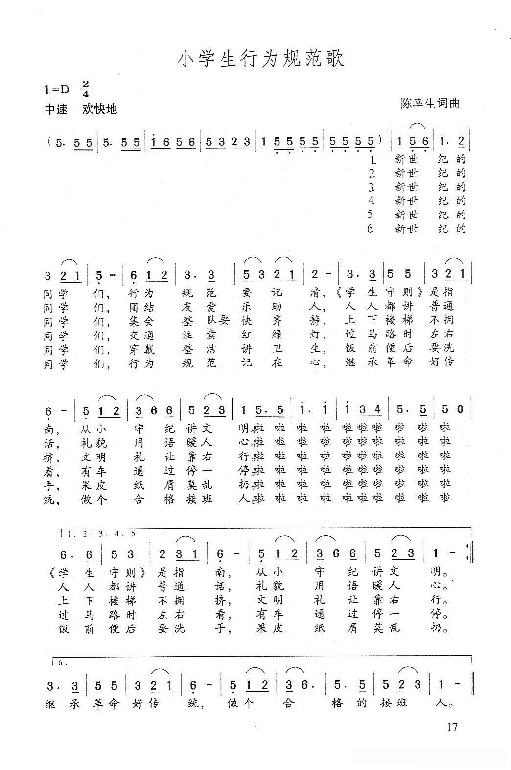 小学生行为规范歌(陈幸生 词曲)的简谱歌词