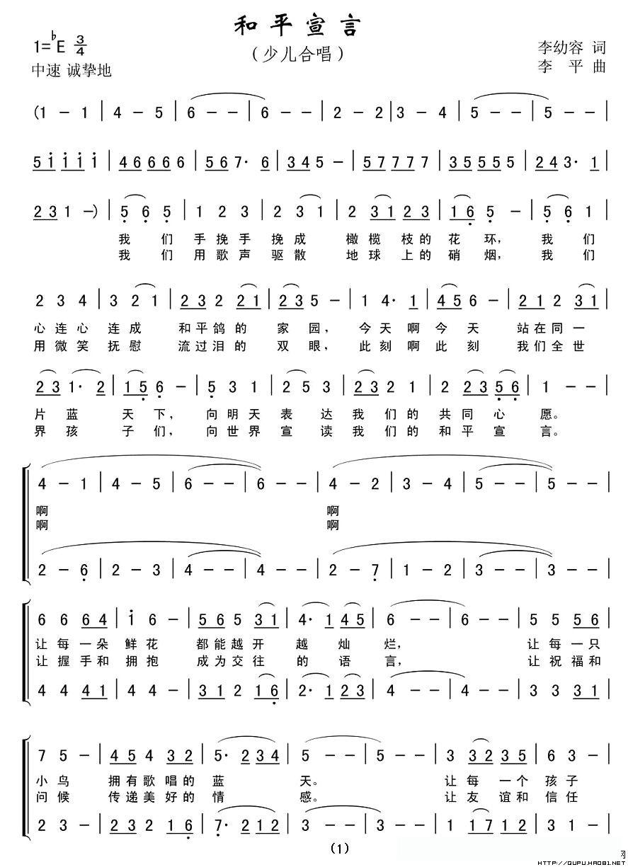和平宣言(合唱)的简谱歌词和平宣言(合唱)的简谱歌词