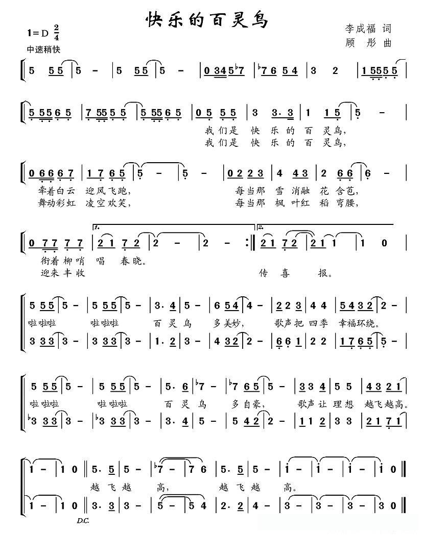 快乐的百灵鸟(李成福词 顾彤曲)的简谱歌词