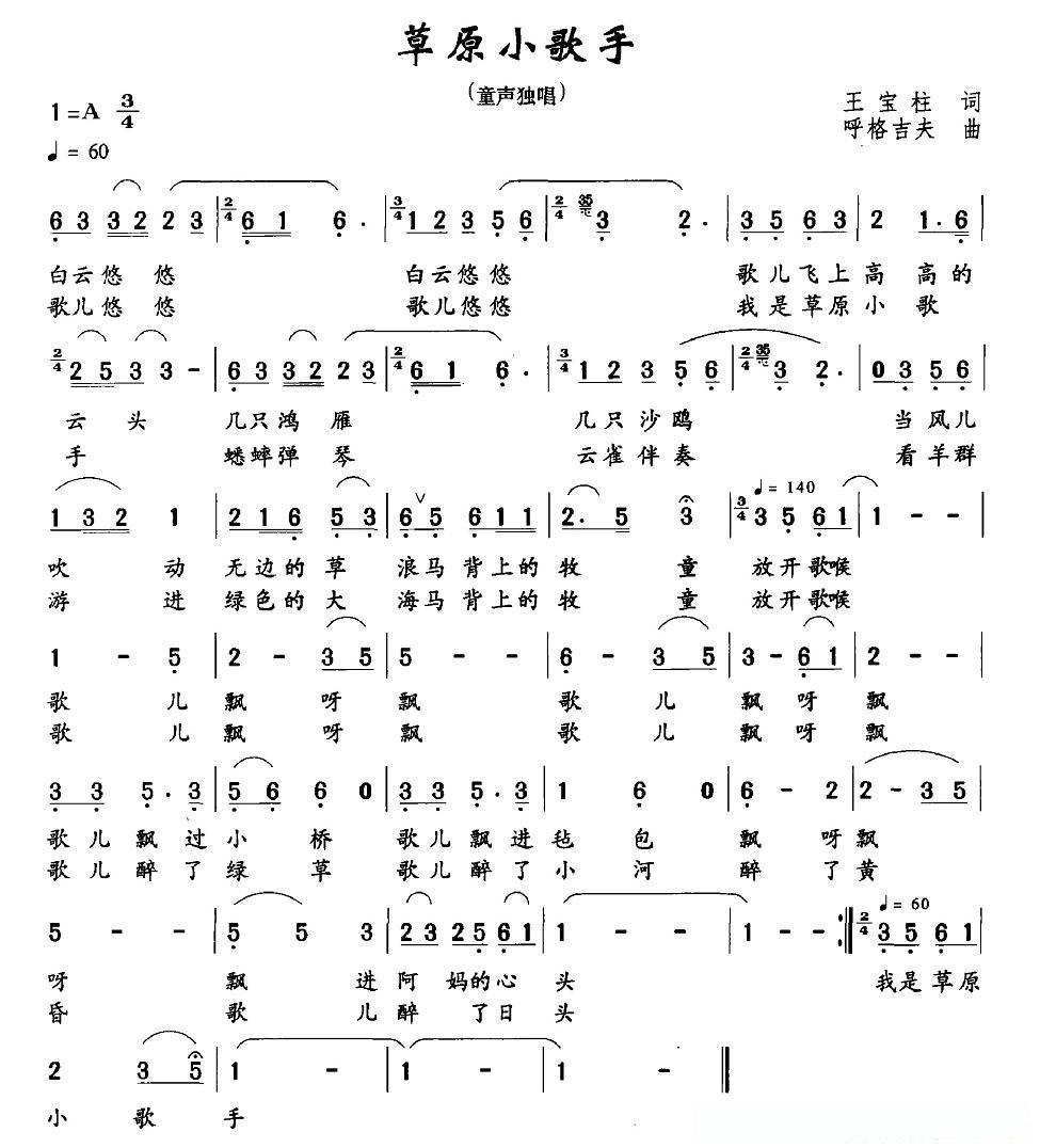 草原小歌手(王宝柱词 呼格吉夫曲)的简谱歌词