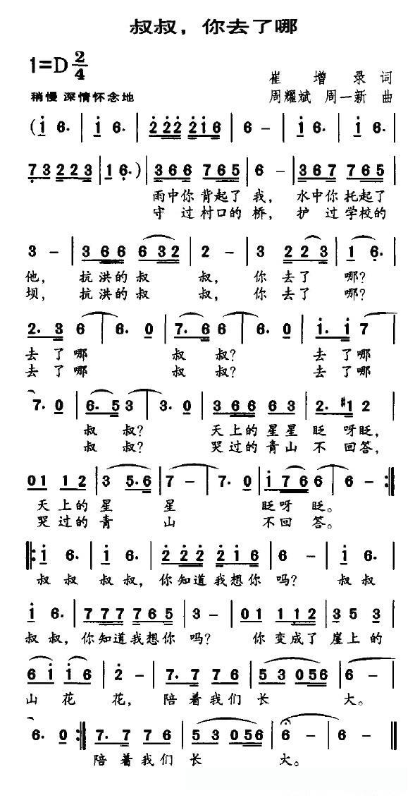 叔叔,你去了哪(崔增录词 周耀斌曲)的简谱歌词
