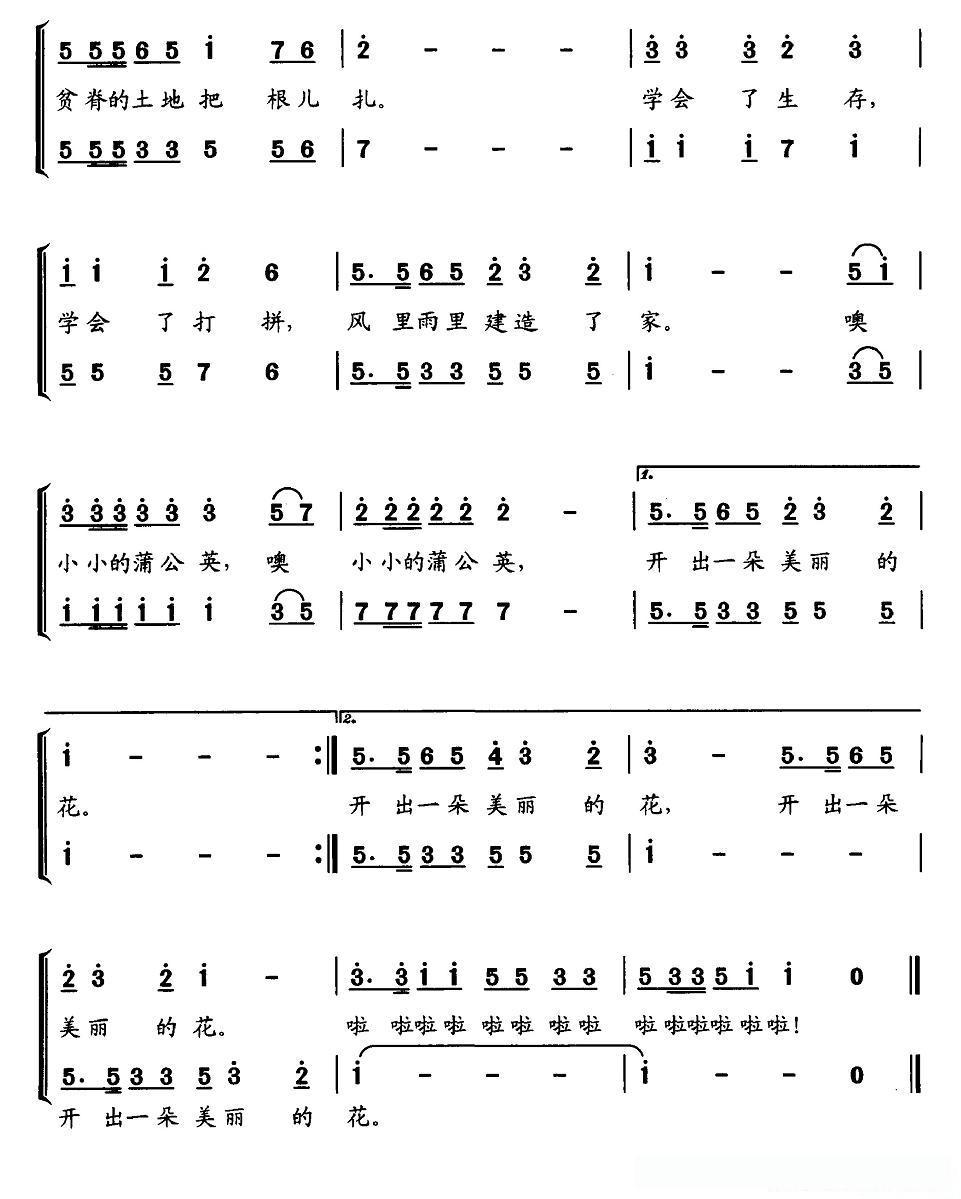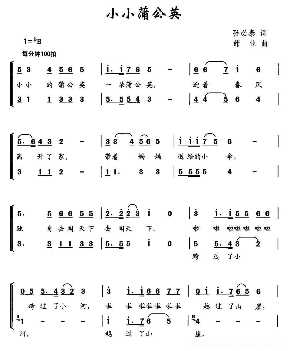 小小蒲公英(孙必泰词 甜业曲、合唱)的简谱歌词小小蒲公英(孙必泰词 甜业曲、合唱)的简谱歌词