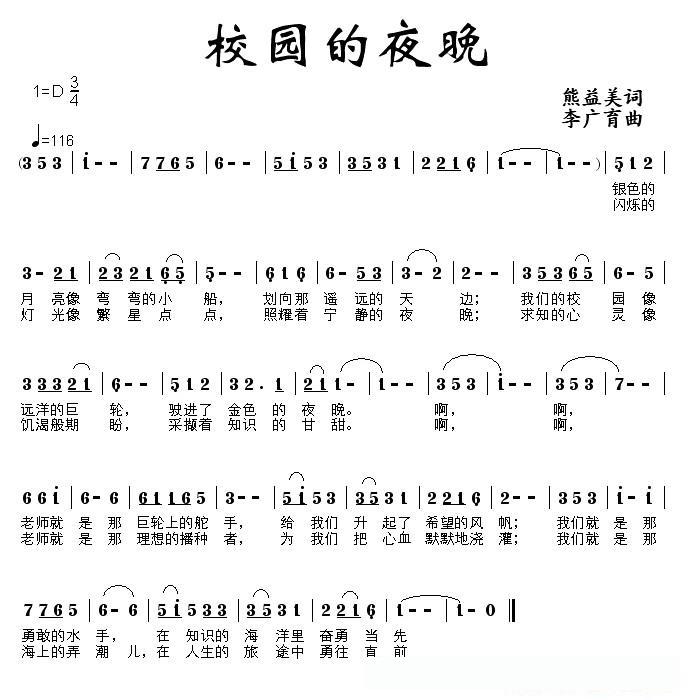 校园的夜晚(熊益美词 李广育曲)的简谱歌词