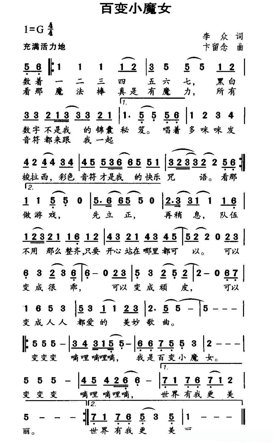 数着1234567 黑白数字不是我的锦囊秘籍 唱着dol re mi fa sol la si 彩色音符才是我的快乐咒语 看那魔法棒真是有魔力 所有音符都和我一起做游戏 先立正 再稍息 队伍不用那么整齐 只要开心站在哪里都可以 可以变得很乖 可以变得顽皮 可以变成人人都爱的 美妙歌曲 变变变 滴沥滴沥滴 我是百变小魔女 变变变 滴沥滴沥滴 世界有我更美丽 变变变 滴沥滴沥滴 我是百变小魔女 变变变 滴沥滴沥滴 世界有我更美丽