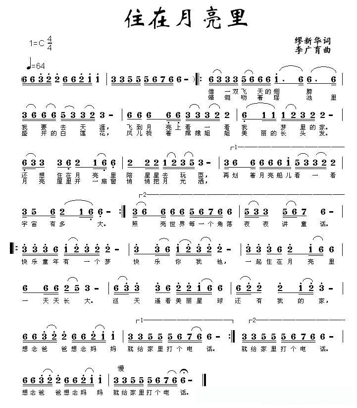 住在月亮里(缪新华词 李广育曲)的简谱歌词