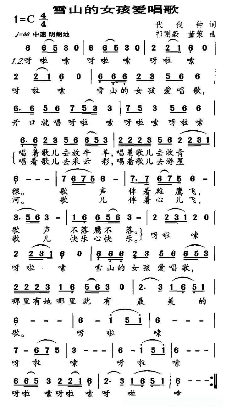雪山的女孩爱唱歌(代伐钟词 祁刚毅曲)的简谱歌词