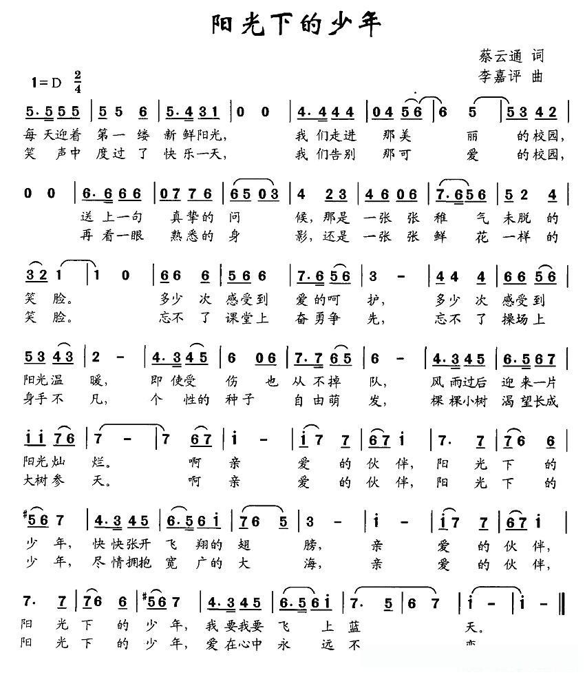 阳光下的少年(蔡云通词 李嘉评曲)的简谱歌词
