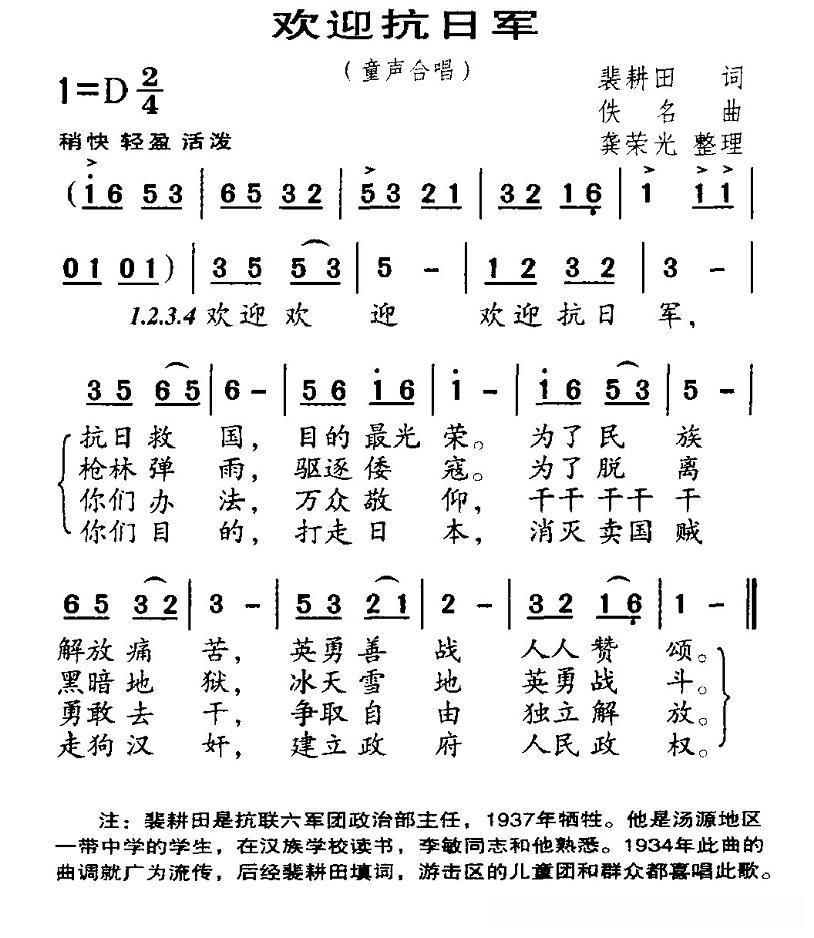 欢迎抗日军的简谱歌词