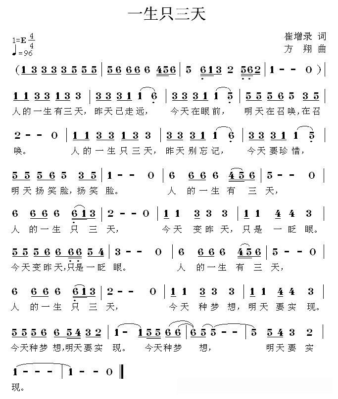 一生只三天(崔增录词 方翔曲)的简谱歌词