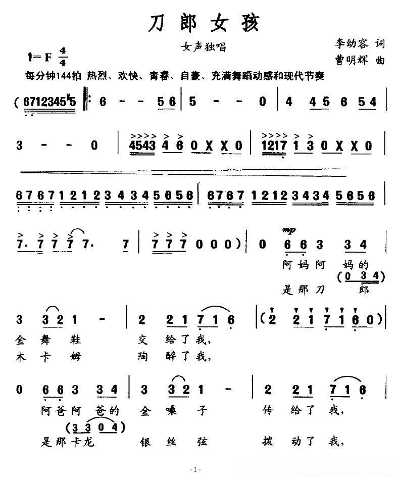 刀郎女孩(李幼容词 曹明辉曲)的简谱歌词刀郎女孩(李幼容词 曹明辉曲)的简谱歌词刀郎女孩(李幼容词 曹明辉曲)的简谱歌词