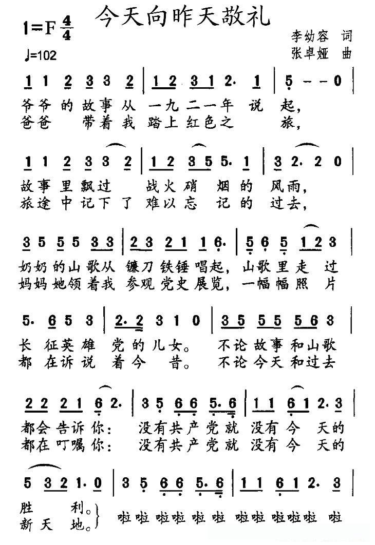今天向昨天敬礼(李幼容词 张卓娅曲)的简谱歌词