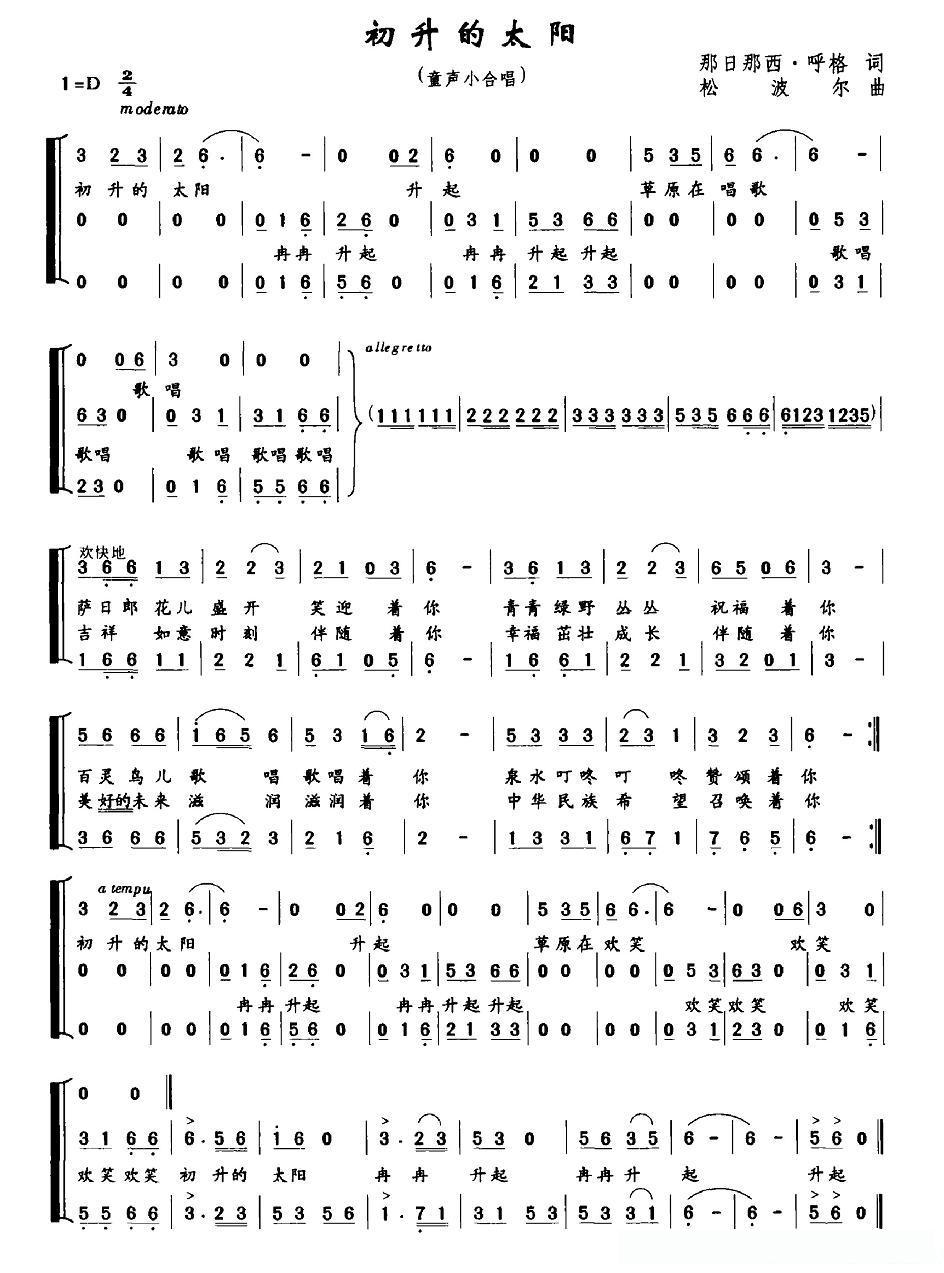 初升的太阳(那日那西·呼格词 松波尔曲、童声小合唱)的简谱歌词