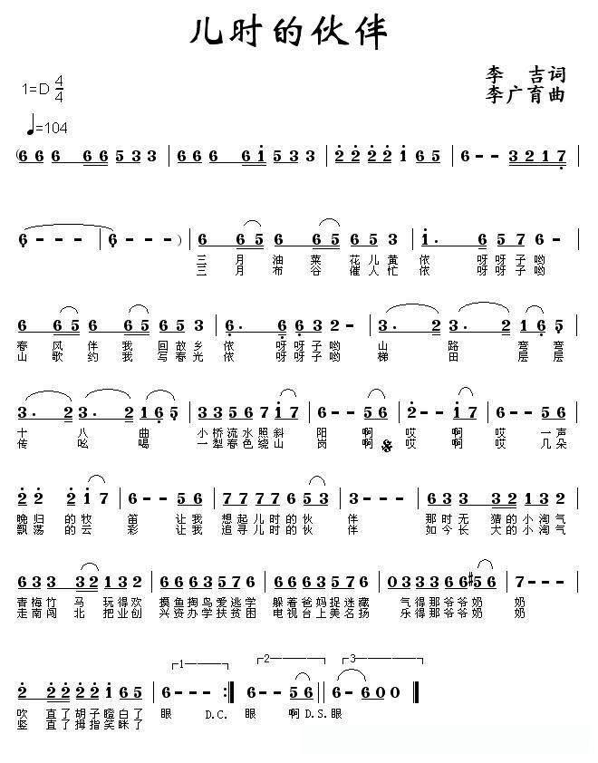 儿时的伙伴的简谱歌词