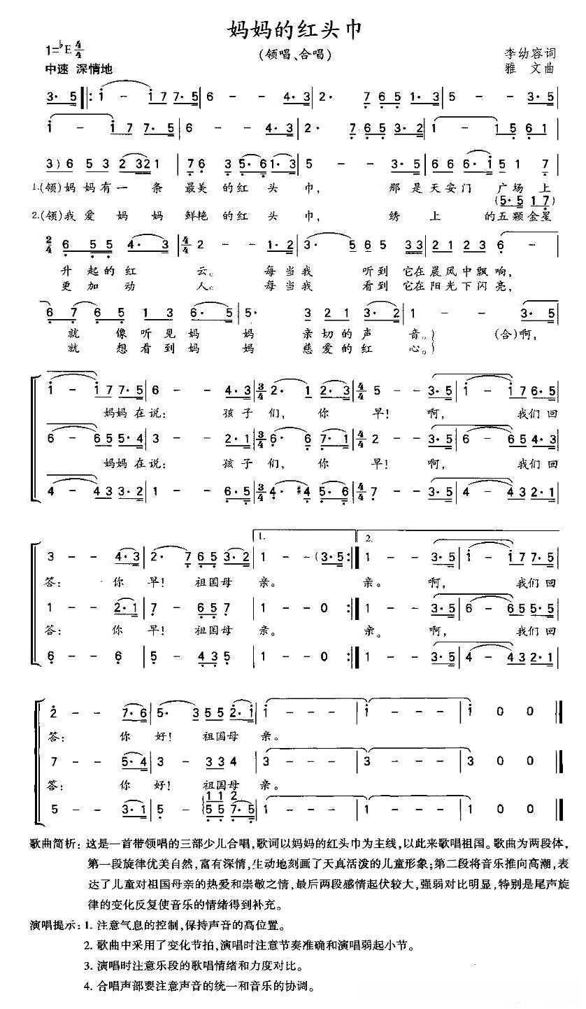 妈妈的红头巾(李幼容词 雅文曲、合唱)的简谱歌词