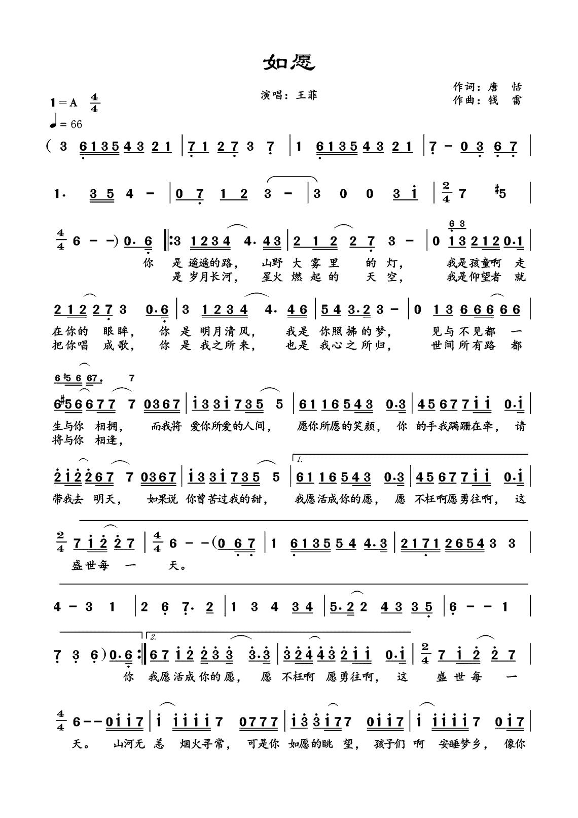 王菲《如愿》简谱