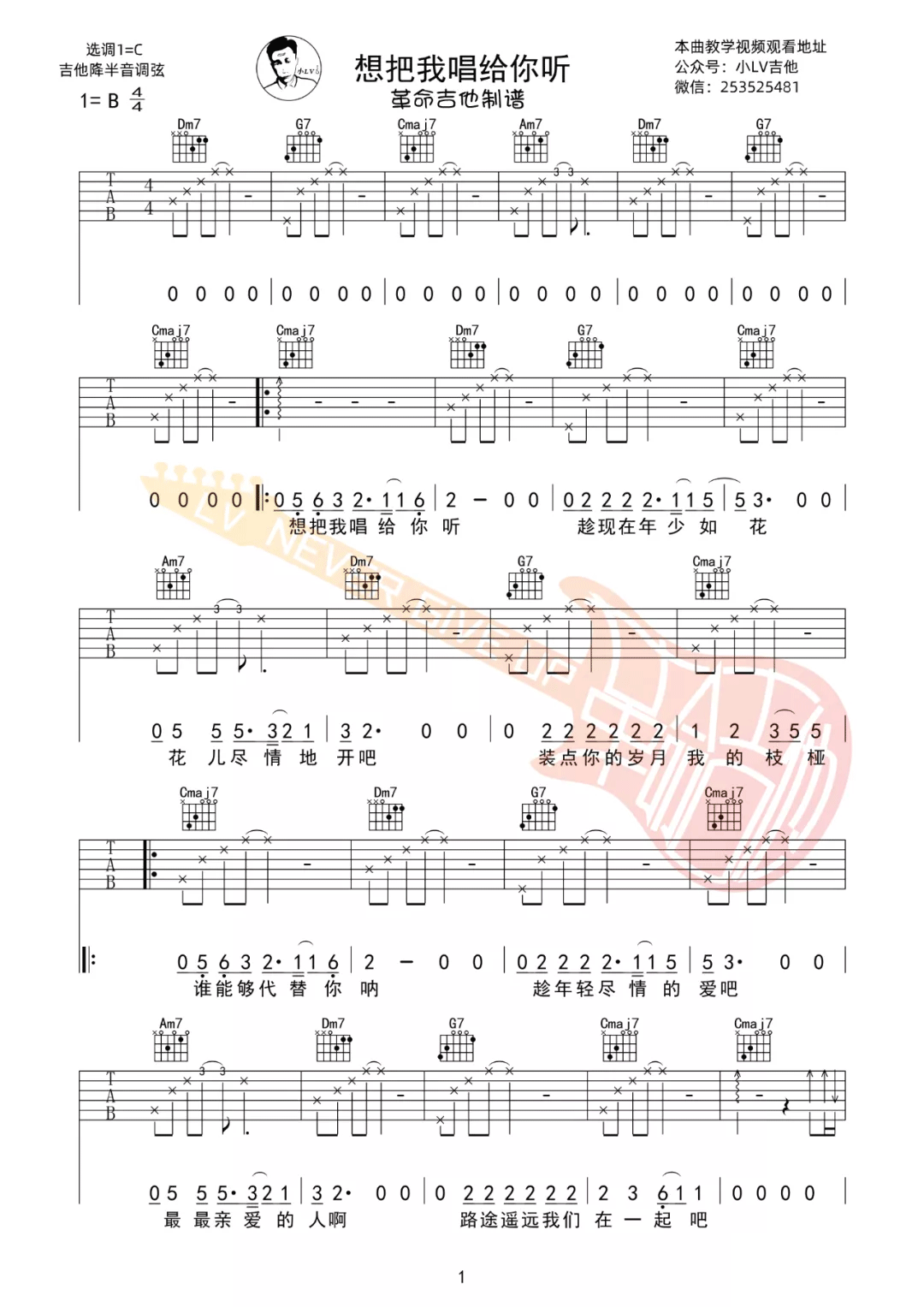 《想把我唱给你听》老狼演唱,吉他弹唱视频教学; 4/4拍的节奏,这首歌曲的原调为B调,这里曲谱采用了C调指法进行编配,演唱时降半音调弦可回到原调 , 来源于@革命吉他编配出品。