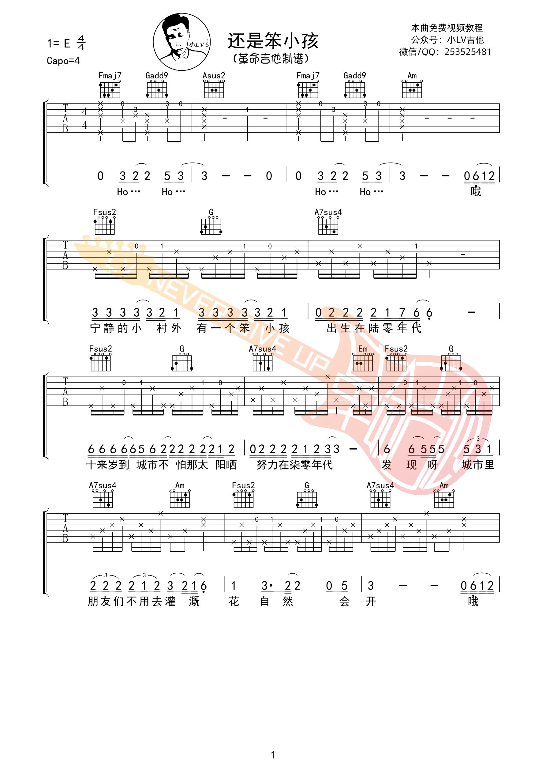 《还是笨小孩》刘德华演唱的一首歌曲,4/4拍的节奏,这首歌曲的原调为E调,这里曲谱采用了C调指法进行编配,演唱时夹变调夹4品可回到原调,也可根据个人实际嗓音情况选择。来源于@革命吉他编配出品。笨小孩这首歌相信大家都比较熟悉了,《还是笨小孩》是电影《奇迹》的主题曲,这首歌算是向笨小孩的一个致敬,但是这里不同于笨小孩的6/8拍,这首歌是4/4拍,唱起来可能有些不太习惯。