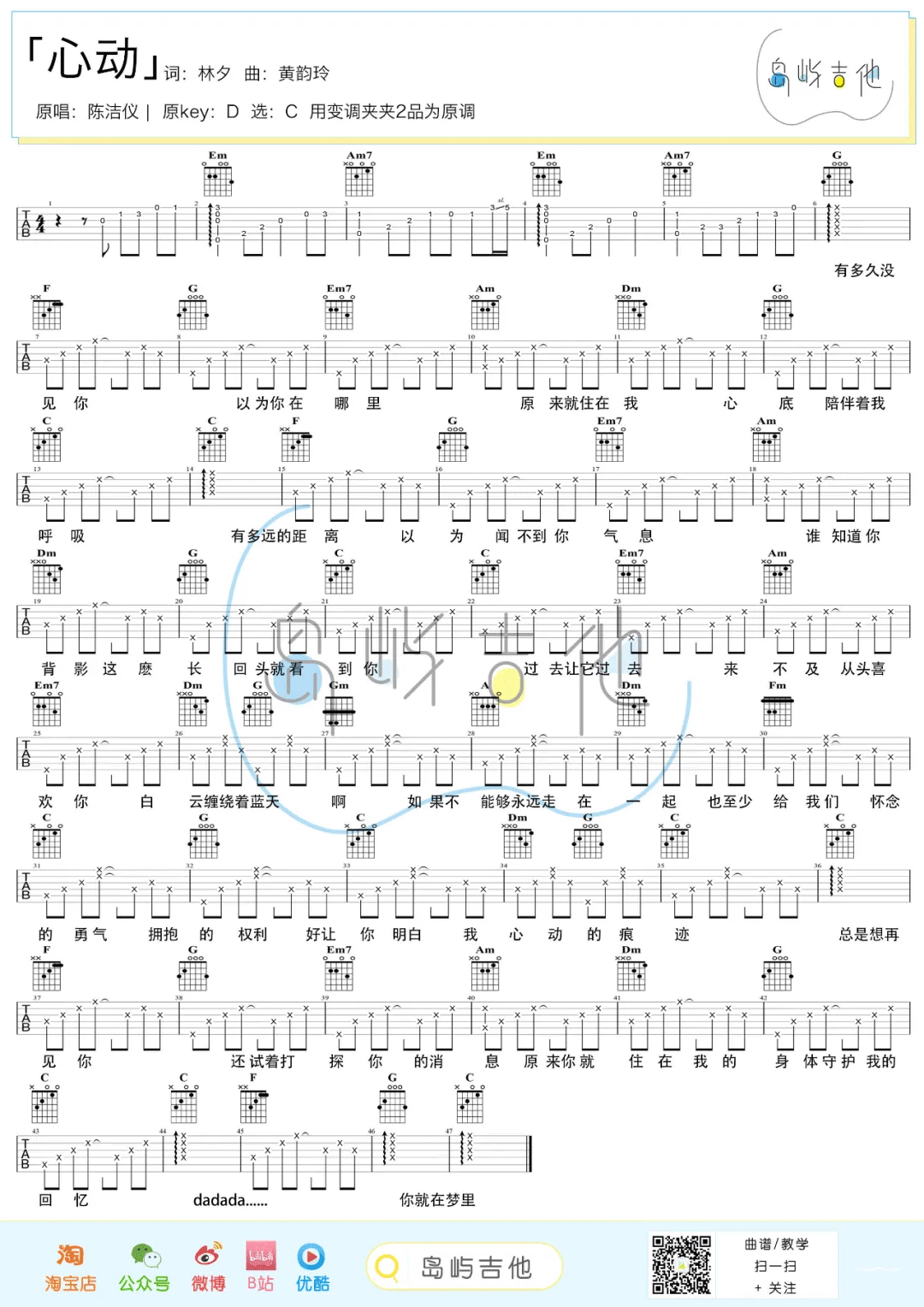 《心动》吉他谱 陈洁仪 C调吉他弹唱视频教学;来源于@岛屿吉他编配出品。这首歌有着无数的翻唱版本,个人最喜欢的还是陈洁仪这个版本的翻唱,不过无论哪个版本,旋律都是非常好听的。