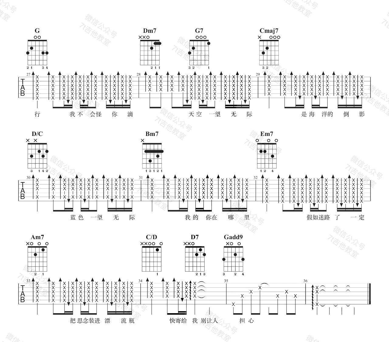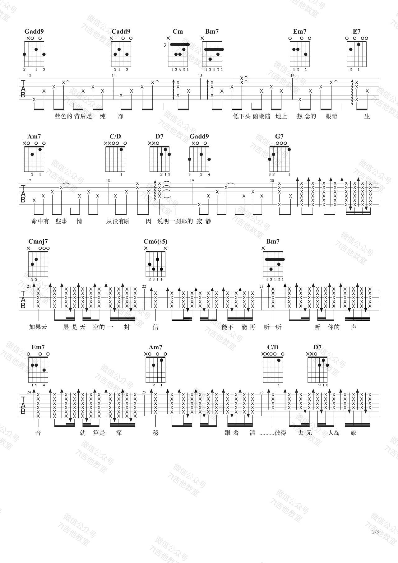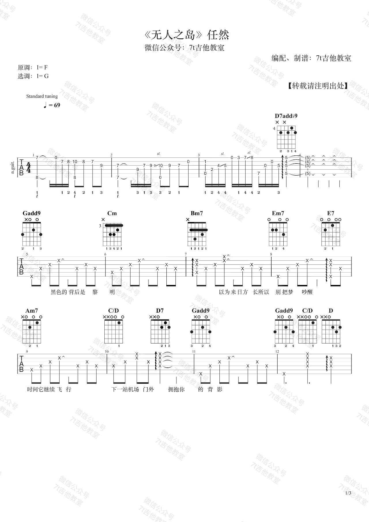 《无人之岛》吉他图片谱,歌曲原调为F调,此版本吉他图片谱来源于@7T吉他教室,为4/4拍的节奏,采用G调指法编配,共3张高清吉他图片谱,变调夹降全音调弦为原歌曲的调式,演唱时可采用个人音域选择合适的变调夹位置。