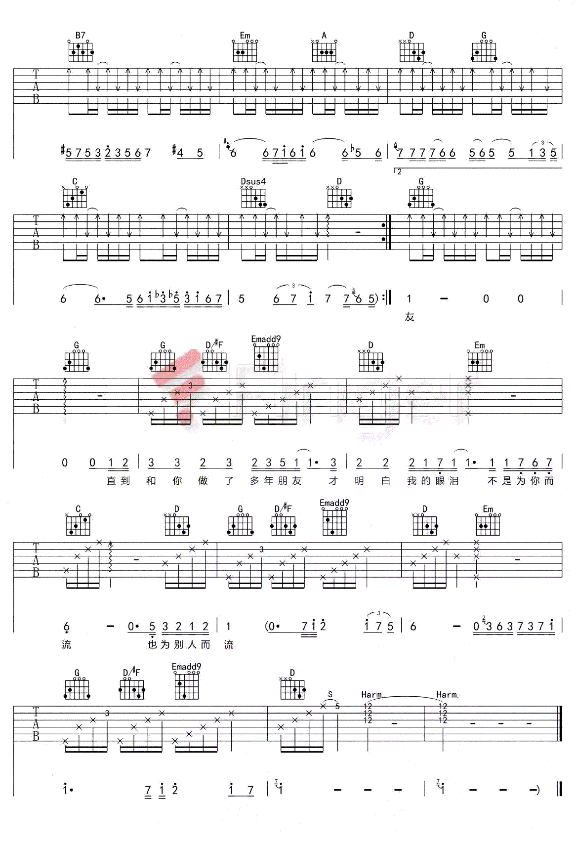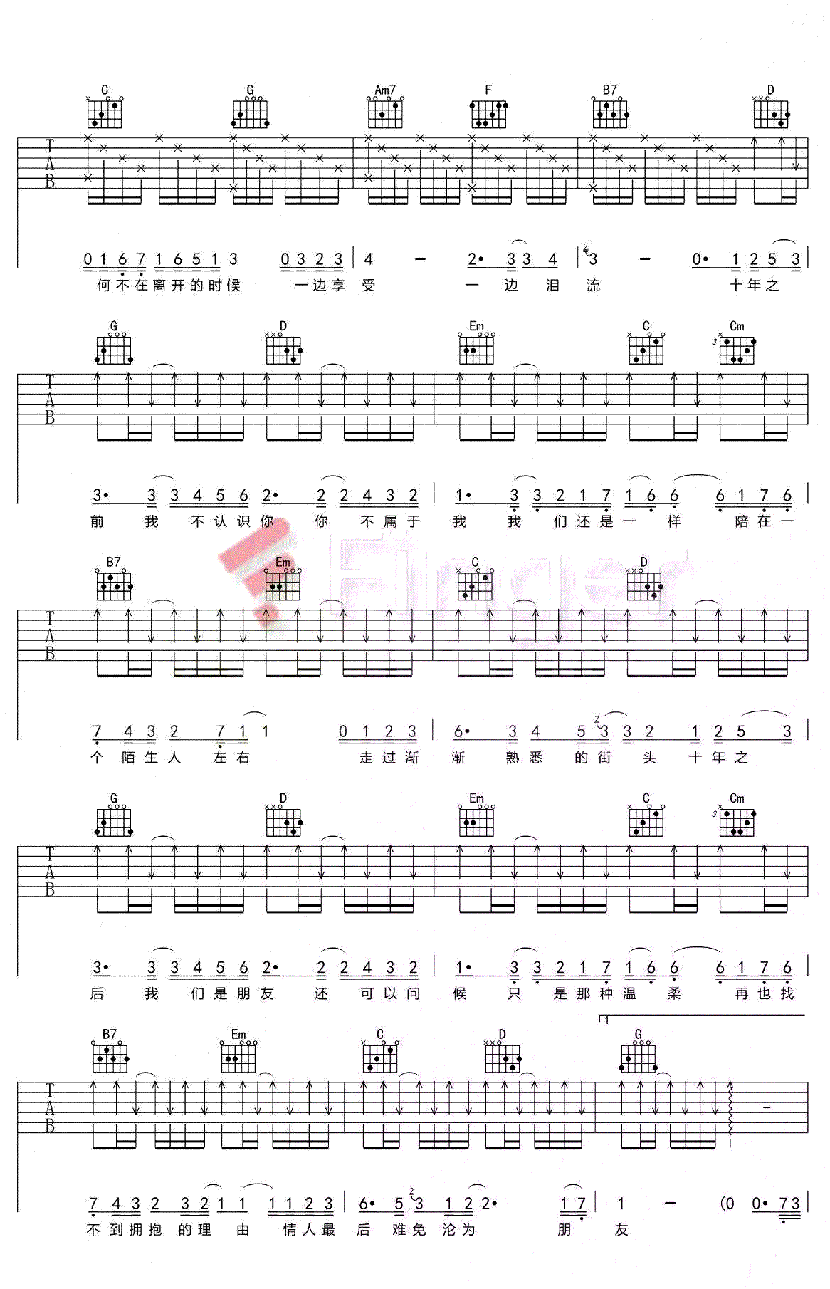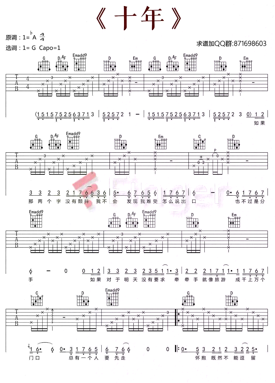 十年吉他谱,陈奕迅演唱的一首歌曲,4/4拍的节奏,这首歌曲的原调为降A调,这里曲谱采用了G调指法进行编配,演唱时夹变调夹1品可回到原调,也可根据个人实际嗓音情况选择。曲谱由酷琴谱更新上传,共3张高清图片弹唱吉他谱例,来源于@Finger编配出品。