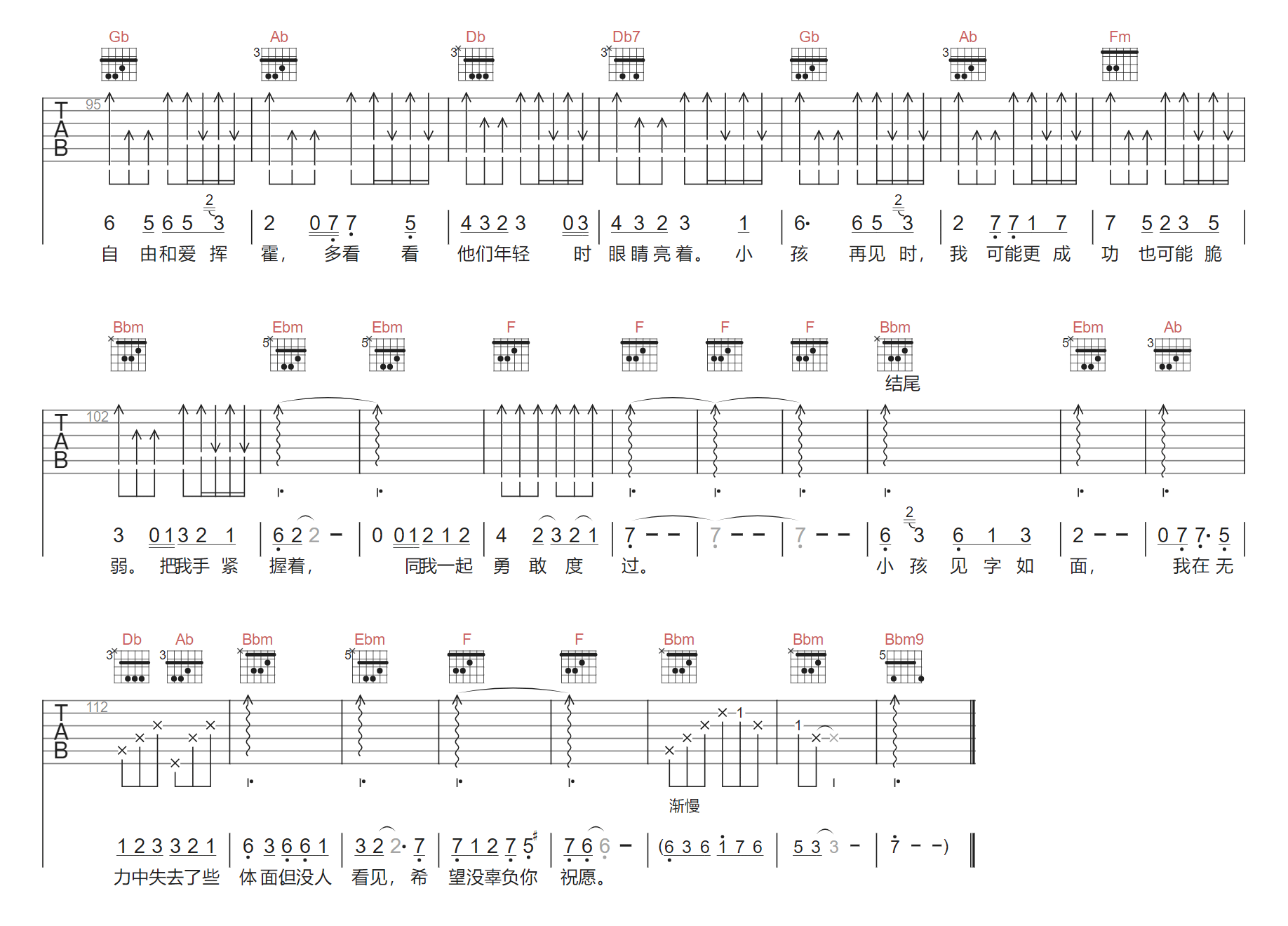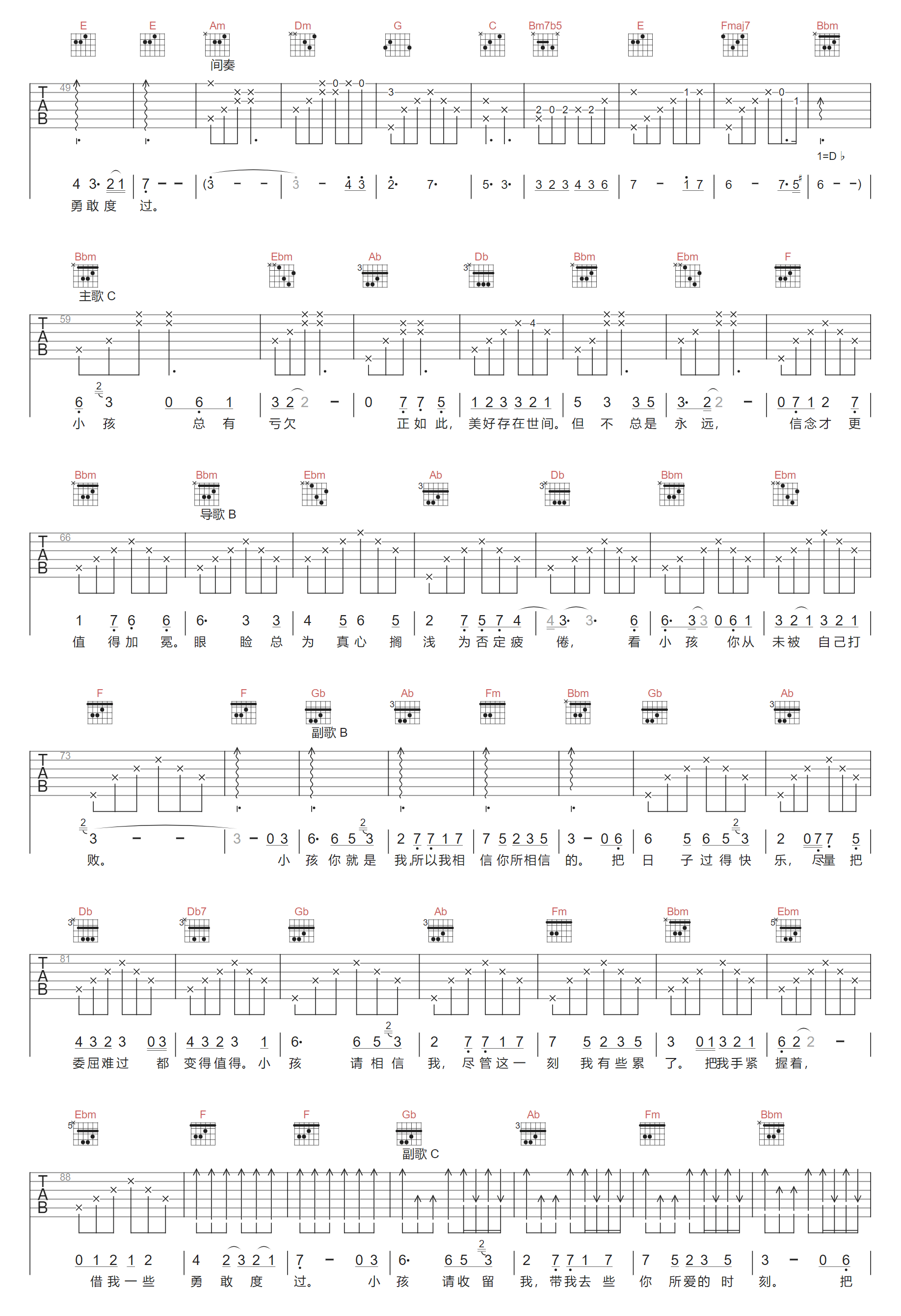弹奏要点:分解和弦打底,副歌处轻扫弦增强情绪张力;转换和弦时放慢速度,突出歌词里与内心小孩对话的细腻情感。这份谱子易上手,适合安静独处时弹唱,用琴弦传递与过往和解的温柔力量。